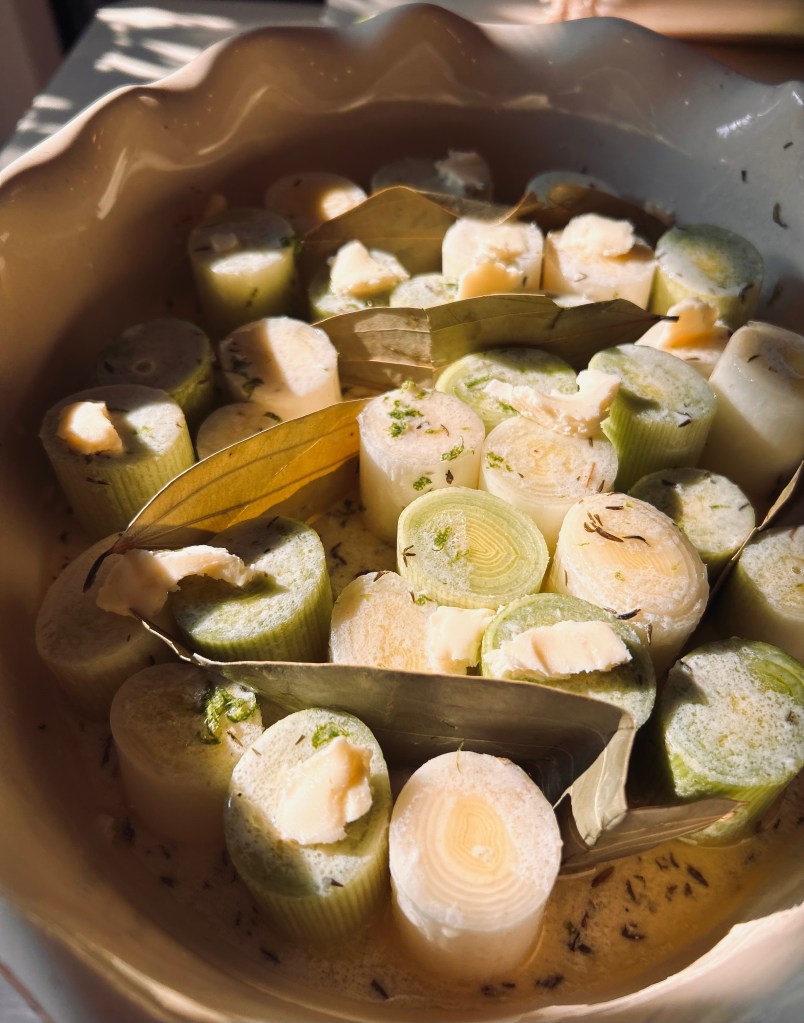 Verser la sauce sur les poireaux. Mettre les feuilles de laurier au travers des poireaux et ajouter un peu de beurre sur le dessus.